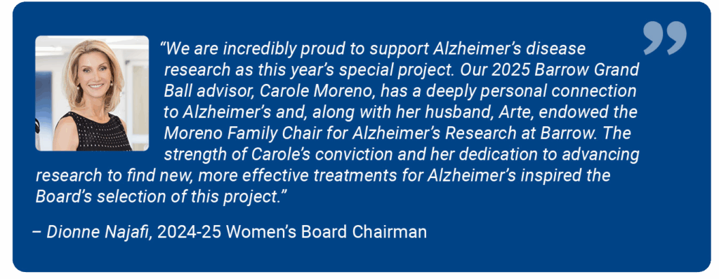 The fundraising highlight for the 2025 Ball followed a 19-year tradition of selecting a critical area of research at Barrow as the Women’s Board Project. The Women’s Board selected the Alzheimer’s and Memory Disorders Program research efforts as its project, raising an impressive $3.2 million through the Ball to advance this work.